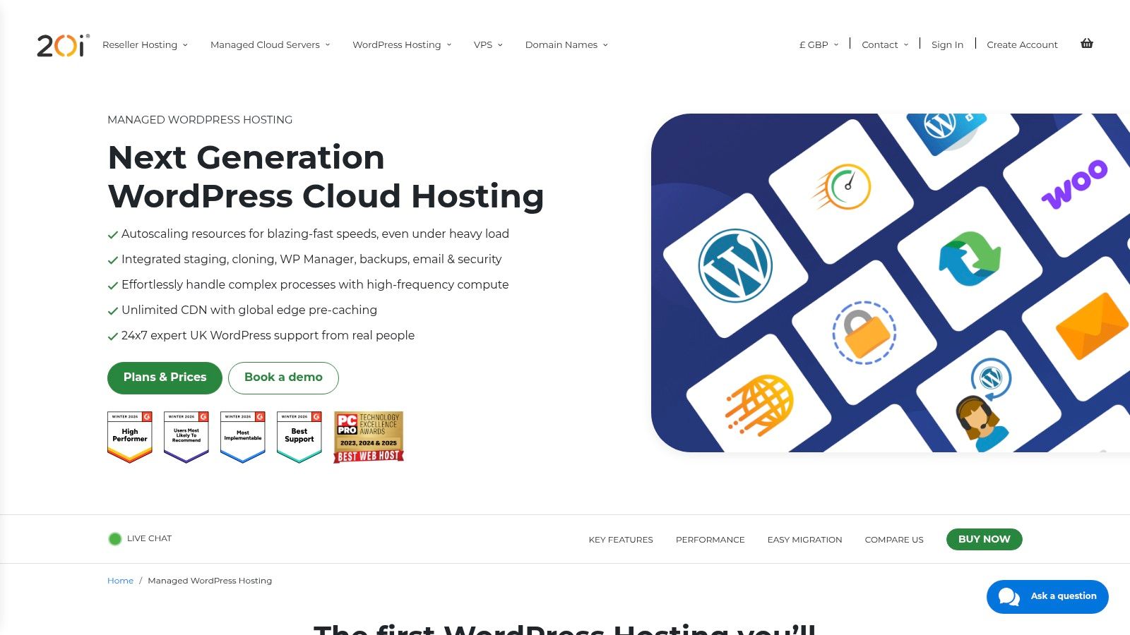 | 20i | 🔄 Moderate — custom control panel and WordPress stack | ⚡ Variable — dynamic autoscaling, global CDN/edge cache | ⭐ Scalable performance for single and multi‑site setups | 💡 Portfolios, agencies and sites needing cost‑effective scaling | ⭐ Dynamic autoscaling, competitive pricing, £1 first month | 📊 Bandwidth/storage allowances vary; learning curve for panel |
